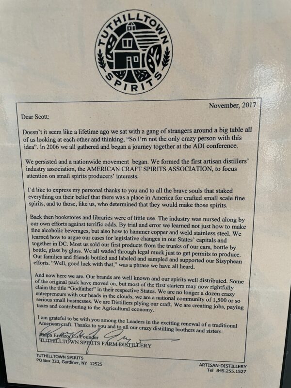 Scott was an original member of the Distilled Spirit Council Craft Distiller Affiliate Membership Program chaired by Fritz Maytag, president of Anchor Steam Distilling and founder of Old Potrero Rye. He traveled with fellow Craft Distiller Affiliate Members to promote American Whiskey in China, Japan and Germany. He was also one of a handful of spirit makers chosen to recreate George Washington’s Peach Brandy at his distillery at Mt Vernon in 2010 along with Scott Harris from Catoctin Creek, Brian and Thomas McKenzie from Finger Lakes Distillery, Ted Huber from Huber Starlight, Rob Cassell from Philadelphia Distilling and the great Dave Pickerell of Maker’s Mark and WhistlePig fame.